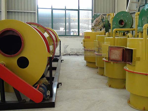 雞屎烘干機現場物料經鏟車送到料倉再送到定量輸送的螺旋進料口進入烘干機內,烘干機筒體內附有揚料板,中間有攪拌打散系統,筒體轉速和攪拌軸的轉速均可快慢調節,從而可使物料顆粒均勻,吸收充分熱量烘干速度快。烘干后的物料經皮帶輸送機運至料場,燃燒部分由煤經煤氣發生爐轉化成煤氣進行燃燒,進一步提高燃料利用率,減少了因煤直接燃燒生成大量硫化物、粉塵造成的污染,烘干過程中的煙氣經旋風除塵器收塵進入水池吸收處理。