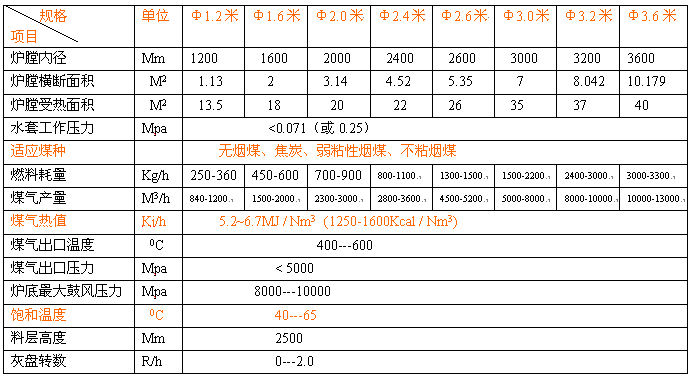 單段式煤氣發(fā)生爐技術(shù)參數(shù)